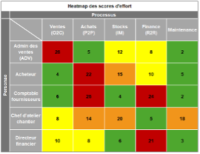 - La détection des foyers de rupture : La heatmap ne se contente pas de lister les changements ; elle révèle visuellement les intersections les plus critiques entre un métier et un processus. Ainsi, les zones « rouges » désignent les efforts d’adaptation les plus importants.