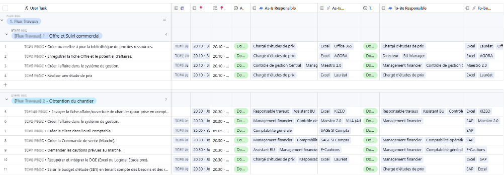 L’analyse ici se fait sur les flux de bout en bout. Au lieu de regarder chaque service séparément, on suit une opération du début à la fin (exemple : du devis au paiement). C’est lors du passage d’une équipe à une autre que les blocages sont les plus fréquents. Pour chaque flux, nous documentons l’évolution des responsabilités (As-Is vs To-Be) : l’enjeu n’est pas de lister les nouveaux boutons, mais de comprendre qui décidait hier et qui arbitrera demain.