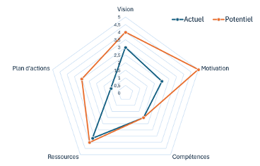 Avant de regarder comment le nouvel ERP va impacter les équipes, on évalue la capacité de l’organisation à changer. Le Change Maturity Assessment ne se contente pas d’un état des lieux ; il mesure l’écart entre la maturité actuelle des équipes et leur potentiel de maturité sur 5 dimensions :
