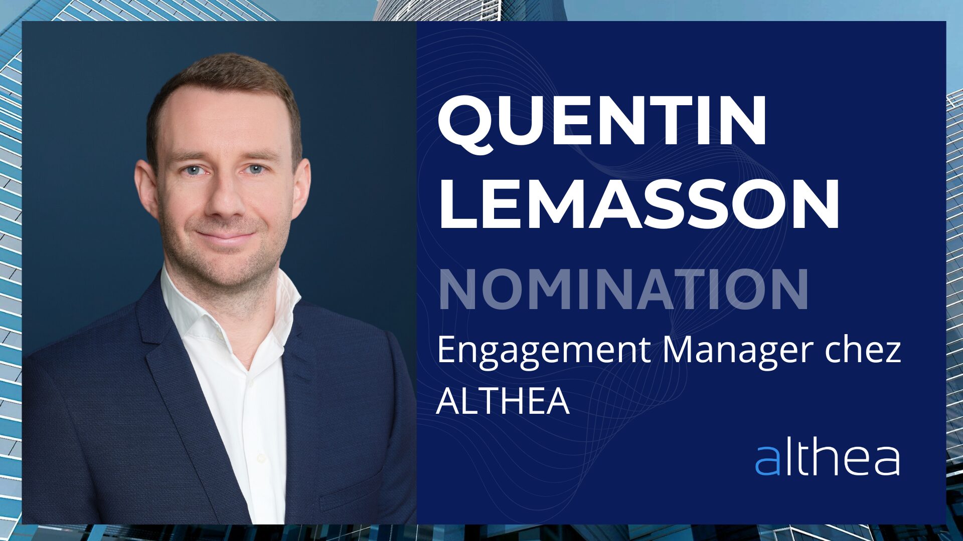 Nous sommes fiers d’annoncer la nomination de Quentin LEMASSON au poste d’Engagement Manager chez ALTHEA. Cette évolution s’inscrit dans la continuité d’un parcours construit depuis maintenant quatre ans au sein du cabinet, marqué par la diversité des missions, une forte capacitée d’adaptation et un engagement constant auprès des équipes et des clients.